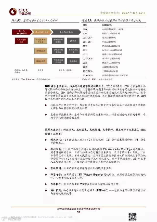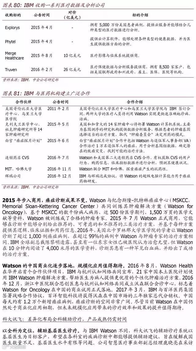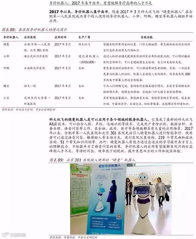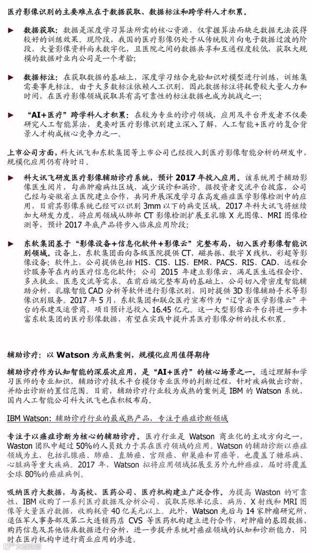 数据比算法重要:我们认为人工智能的商业化,仅仅依靠技术是 很难继续走下去的。数据的规模和采集能力决定了人工智能在这 个行业的发展速度。在这方面,感谢线上消费的发展和十几年平安城市建设,互联网和安防行业的智能化走在了其他行业前面。看好海康威视、大华股份、科大讯飞、东方网力、千方科技、阿里巴巴、腾讯、新浪在安防和互联网行业的 AI 变现机会。医疗大数据是下一个热点,看好东软、思创医惠和东华软件在医疗大数据领域的长期成长机会。