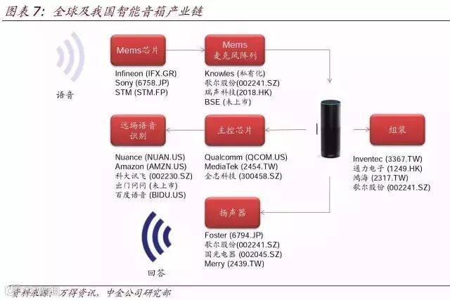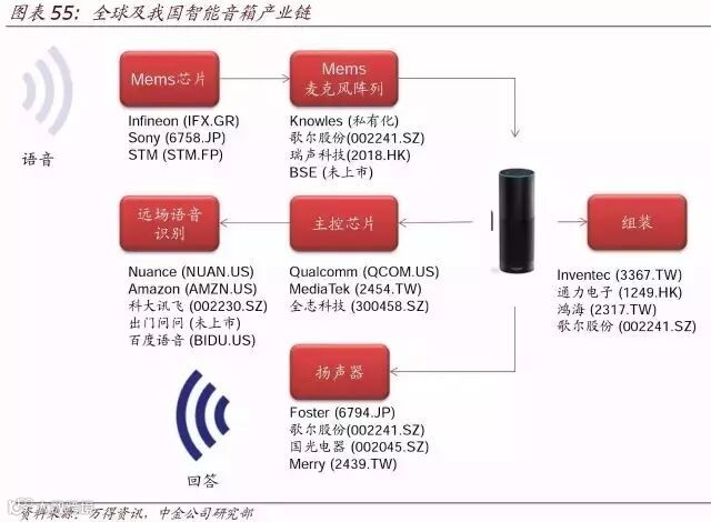 智能音箱主要由麦克风阵列,远场语音识别算法和扬声器组成。Amazon 最早开发实现 基于麦克风阵列的远场语音识别,大幅度扩大了语音识别的应用场景。亚马逊设计了一 个名为“ARS”的自动语音识别处理系统。ARS 由七个麦克风和一个音频信号过滤系统 构成。七个麦克风组成的列阵能让 Echo 捕捉到环境中的细微声音,音频信号过滤系统过 滤掉环境噪音,从而辨别出人声。使用 ARS 后,即使用户在 25 英尺(7.62 米)之外发 出命令,Echo 也能够准确识别。除了 Amazon 以外,科大讯飞和联发科也开始提供类似 整体解决方案。中国公司中,歌尔股份(002241.SZ),瑞声科技 (2018.HK)等是全球重要 麦克风阵列厂商,国光电器 (002045.SZ),通力电子 (1249.HK)是主要音箱厂商。