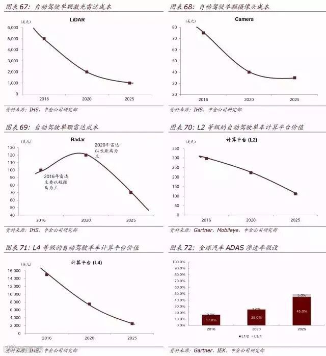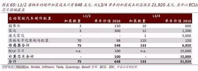 目前硬件价格高昂阻碍 L3/4 普及:我们对 SAE 要求的各等级自动驾驶需要加装的硬件 成本进行了测算,主要分为计算芯片和传感器两部分。从 L1 到 L4,级别越高,所需要 加装的硬件成本也在上升,整体而言,2016 年 L1/2 的单车电子加装成本为 648 美元, L3/4 则需 21,920 美元,其中中央控制和处理器占据绝大多数成本,例如,Nvidia Drive PX2 的售价高达 1.5 万美元。