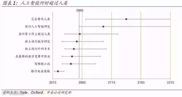 根据耶鲁大学和牛津大学的研究人员对 352 位人工智能专家进行了采访,人工智能到2060 年前后有 50%的概率完全超过人类。这份研究预测在 10 年内,人工智能将会在以 下领域超过人类:翻译领域(2024),高中水平的写作(2026),驾驶卡车(2027)。
