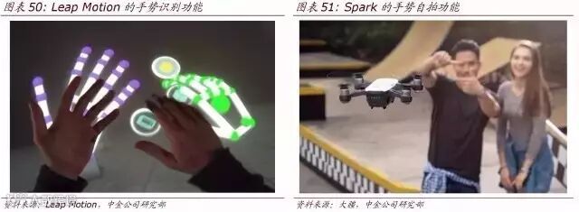 大疆 Spark 将目标跟踪与机器视觉算法相结合:2017 年 5 月,大疆 Spark 发布, 在无人机上引用红外感测的 3D 手势识别,原理是将计算机视觉算法中的手势识别 和目标跟踪算法与普通的工业摄像机相结合,带动手势识别的应用领域扩展到消费 级无人机。