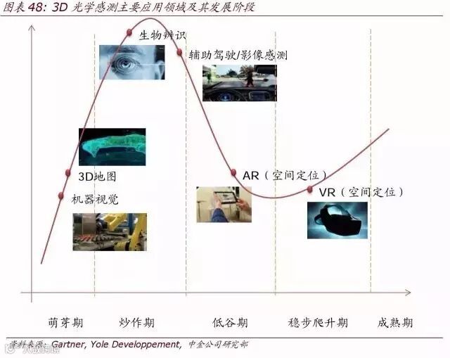 算法难度从简单到复杂。在硬件上,3D 光学感测在发射与接收端已非常成熟;在算法难 度上,生物辨识与机器视觉属于较为基础的应用,而辅助驾驶、3D 交互则需要叠加多种 基础方案配合形成,到 AR 与 VR,则需要前几种技术的综合叠加和有机应用,且对处理 器的运算能力要求极高。