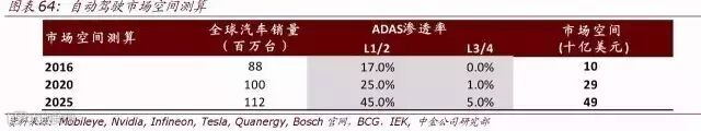 自动驾驶硬件规模 2025 年可达 486 亿美元。Gartner 认为,现有汽车电子占全球半导 体市场仅为 10.0%左右,2017 年市场规模 2017 年将成长 6.2%达到 343 亿美元,2018 年增长 7.2%至 358 亿美元。我们通过对各等级的自动驾驶渗透率进行了测算,在 2025年自动驾驶传感器与计算芯片的规模可达 486 亿美元。