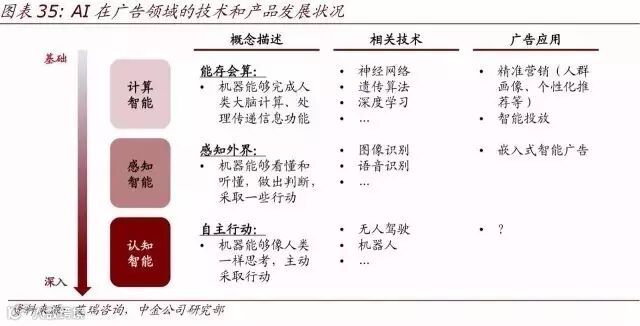 人工智能(AI)在广告营销领域的应用是现阶段 AI 商业化应用最成熟的领域之一,从AI 技术的应用阶段来看,已经初步进入感官智能的范畴,且在计算智能领域的技术和使 用场景已经有充分的发展。精准营销和智能投放就是其中最重要的应用形式,主要的思路是利用高互联网/移动互联网渗透率下积累的大数据(根据《2016 年腾讯智慧营销白 皮书》,当年互联网每日产生数据量已达 18 万亿 GB),通过数据挖掘和机器学习等手段, 建立营销对象、产品以及媒介的个性与传播模型,再通过 AI 技术进行高效的智能投放。