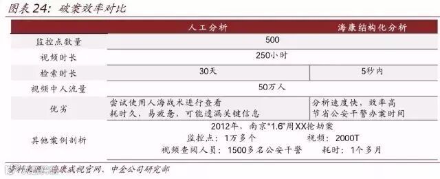 另一个案例是,2012 年的“1.6 苏湘渝系列持枪抢劫杀人案”,当时对 1 万多个监控点产 生的 2000 多 T 数据进行人工查阅,投入了 1500 多名干警耗时一个多月。根据海康威视估算,如果采用人工智能分析仅需要几分钟。