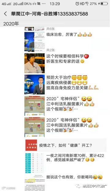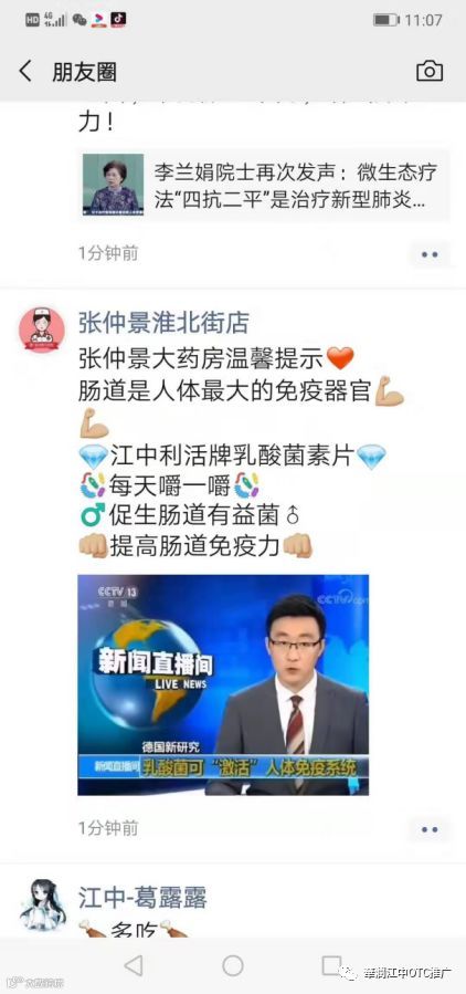 将专家和中央电视台13频道的“新闻直播间”关于增强免疫力,改善人身体微生态系统视频、图片、资料等要求河南大区销售人员和河南张仲景连锁店员通过微信高密度,多频次的进行转发,同时转发江中利活牌乳酸菌素片主视觉KV,向消费者宣传日常调理肠道、提升肠道免疫力的重要性。