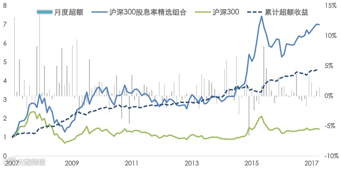 我们基于”先选行业-再选个股”的思路在沪深300的样本池中构建了高股息组合,从组合表现来看,从2007-01-01至2017-04-27回测期间,高股息组合年化收益达19.8%,相对于沪深300指数,年化超额收益为14.2%,月度超额胜率为68.3%,年度超额胜率达100%,信息比率为1.61,换手率仅为25%。