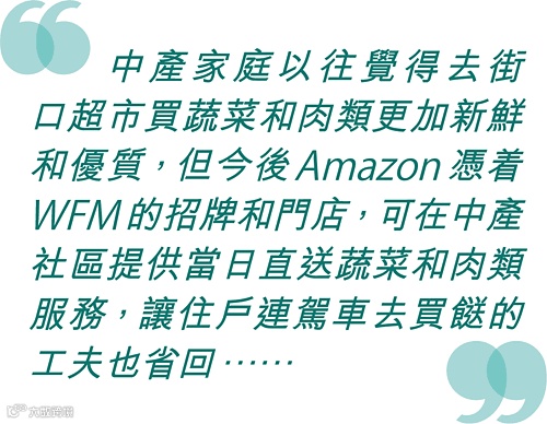 从牌面看,Amazon今次斥巨资收购,反映除了洗头水和厕纸之外,还会加强进军食品类别销售,尤其是传统超市仍具优势的新鲜、高档和有机食品。举例说,中产家庭以往觉得去街口超市买蔬菜和肉类更加新鲜和优质,但今后Amazon凭着WFM的招牌和门店,可在中产小区提供当日直送蔬菜和肉类服务,让住户连驾车去买餸的工夫也省回,届时Wal-Mart、Tesco等超市将更难在新鲜和有机食品这个「油水地盘」跟Amazon争客仔。