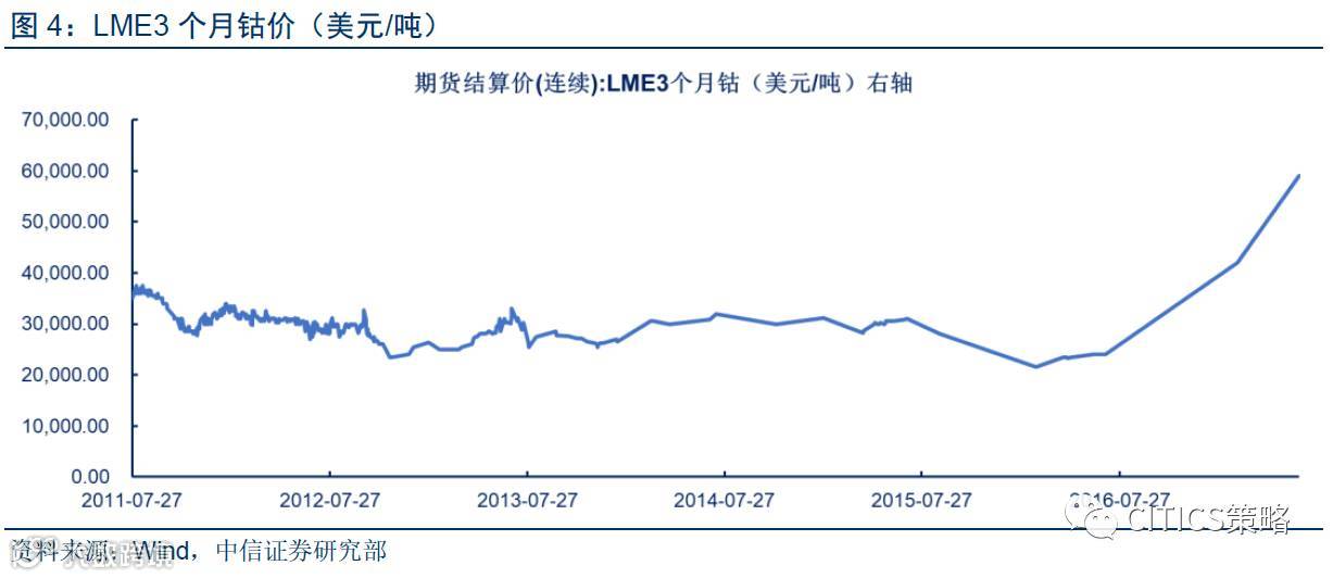 2017年钴供需格局由过剩转为短缺,新能源动力电池需求放量,预计未来钴会持续紧张。目前钴供应端还有手抓矿等冲突地区矿产因素的干扰,加之回收技术没有系统化突破,钴价有望进一步上行。