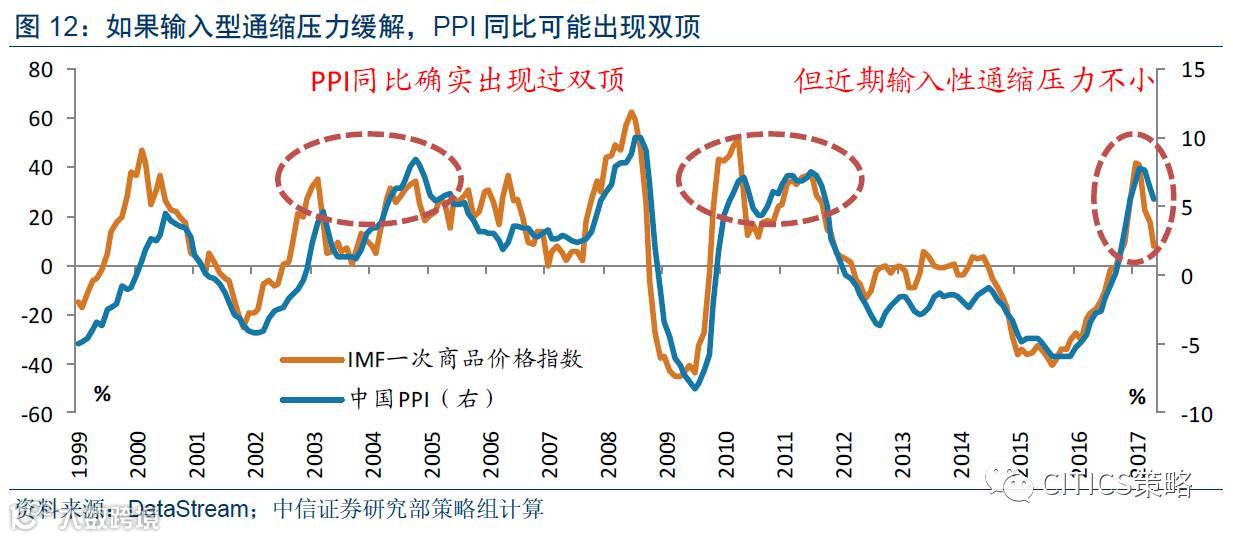 2017年3月以来以来国际油价震荡走弱,而国际大宗商品价格指数同比也明显回落,中国作为国际贸易体系中重要的加工生产型国家,最近几个月PPI走势中包含的输入性通缩的压力并不小。