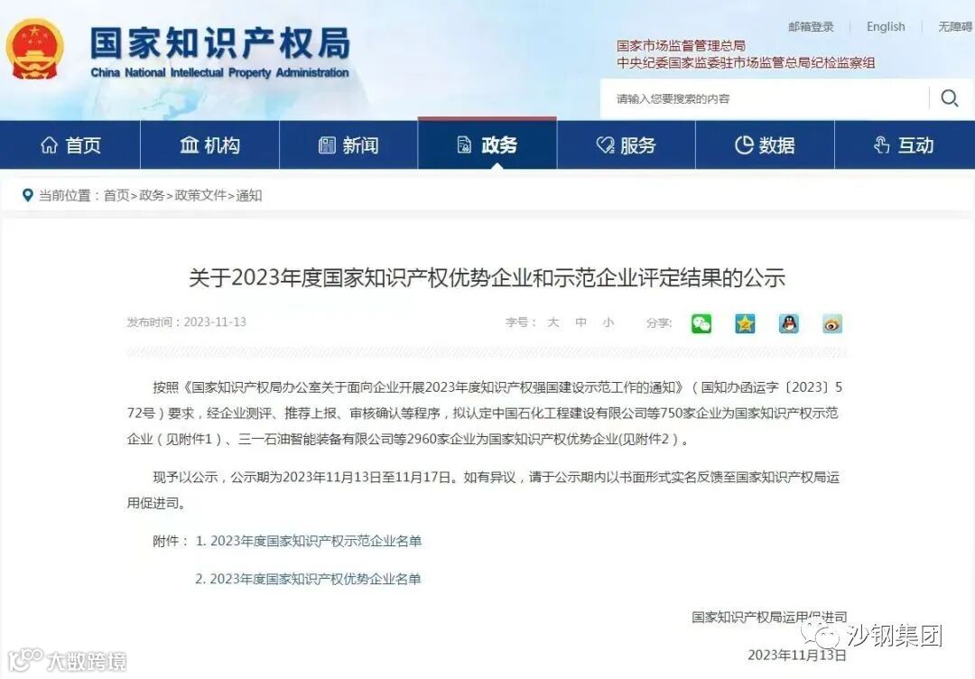 沙钢先后获批承担多个省知识产权战略推进计划项目、江苏省/苏州市高价值专利培育计划项目、苏州市企业知识产权登峰行动计划项目、苏州市知识产权和标准融合计划等项目;累计申报专利3200余项,拥有有效专利1700余项,先后荣获中国专利优秀奖、省级专利优秀奖、苏州专利奖等多项荣誉。