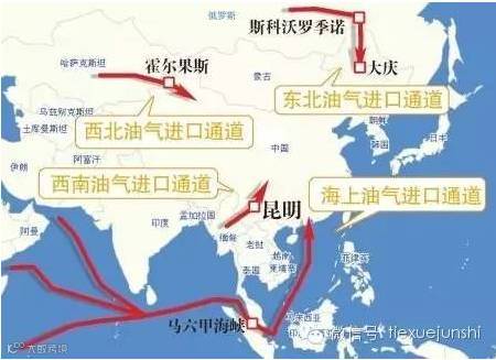 美国是不会坐以待毙的。那要怎么做呢,答案就是中国最大的软肋——资源。2014年,中国消耗的石油60%需要进口,而且中国85%的 石油都要走马六甲海峡,如果美国封锁了马六甲海峡对中国实行石油禁运,那么中国的经济别说实现经济增长,很可能出现经济衰退,而且衰退会提高失业率,大面积失业可能会引发社会动荡,这一系列的连锁反应甚至会导致中国的崩溃。所以我们看到美国高调“重返亚太”,在日本、菲律宾、新加坡的美军基地增加军事部署。下图就是中国的资源进口通道,而其中最重要的就是要经过马六甲海峡的海上通道。