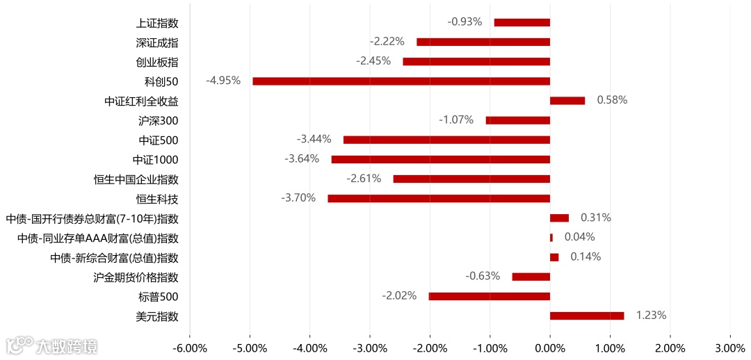 债券&商品市场方面,债市受避险资金流入推动整体走强,中债-国开行债券总财富(7-10年)指数上涨0.31%,中债-新综合财富(总值)指数上涨0.14%。黄金在美元走强与美债收益率攀升背景下高位回调,伦敦金跌2.09%,沪金跌0.63%。
