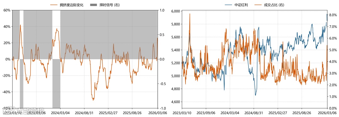 中证红利指数股息率约为4.68%, 从景气度、波动率和股息率三维度打分模型来看,红利风格里面的电力与公用事业、消费者服务、非银打分排名靠前。短期拥挤度来看,当前中证红利指数的成交占比处于历史较低水平,拥挤风险较低。