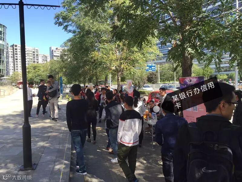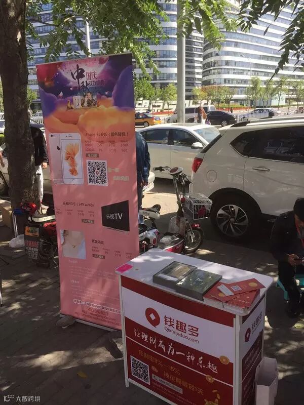 在这条街上,不到100米的距离内,聚集了27个左右的地推点,这里面绝大多数是互联网公司。他们把摊位摆在人行道上,城管不会来干扰,商圈的保安用绳子划出了范围,互不侵犯。