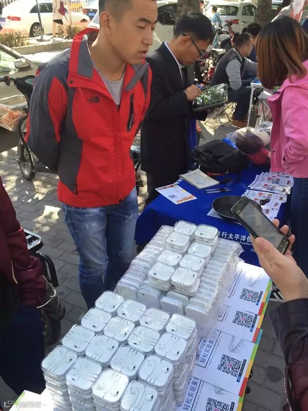 美呀隐形矫正。乍一看以为是送苹果耳机了,这么土豪,一桌子摆的都是。很刺激扫码欲望。这家要求扫码关注,并且转发一个他们的信息到朋友圈,以此来获得山寨耳机。