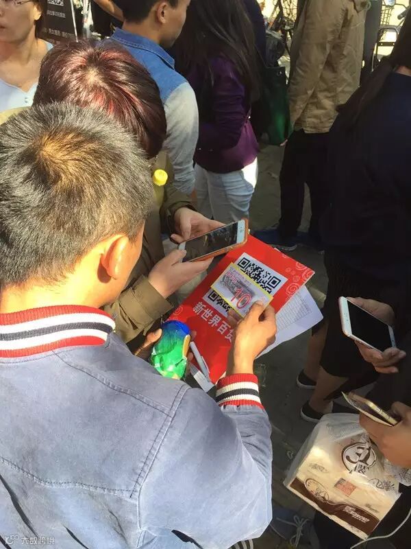 “扫码一条街”所挨着的地方是一个商圈,这里有电影院、餐馆、超市。每到中午的时候,大量人流会通过2号塔和3号塔夹着的那条通道涌出望京 SOHO 园区,过马路到这里就餐。他们会经过这“扫码一条街” ,那些地推人员试图用吆喝和礼品还有传单来吸引路人驻足,期望你能看一看加个微信关注或者给他们的 App 注册一个账号。