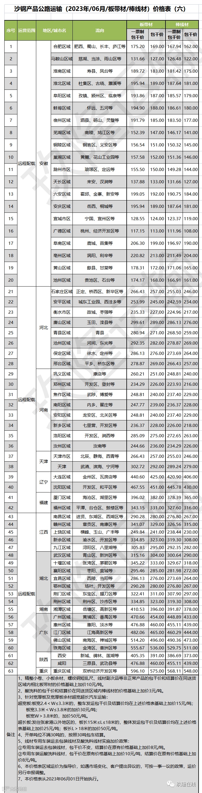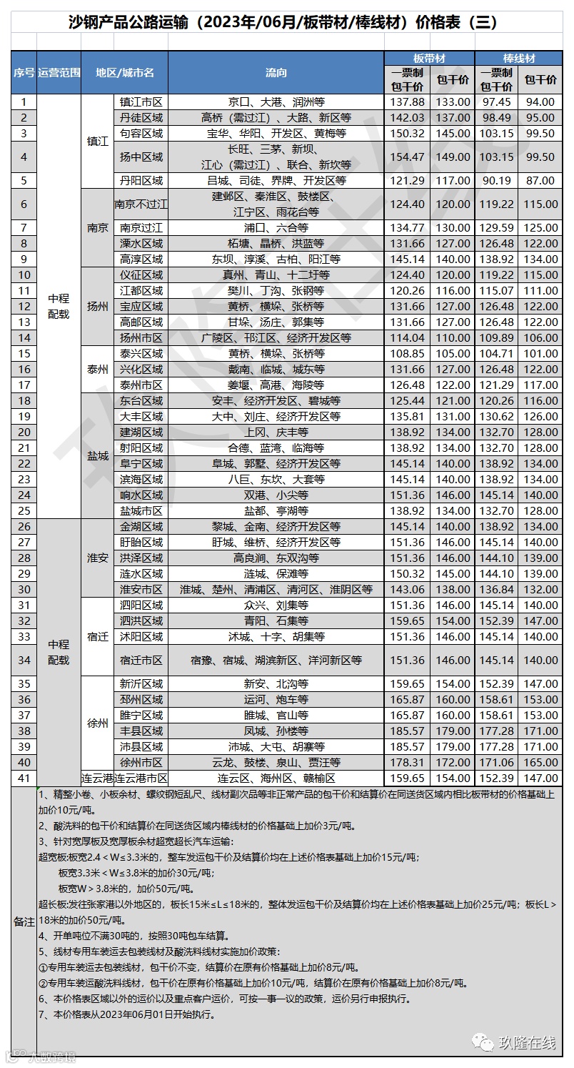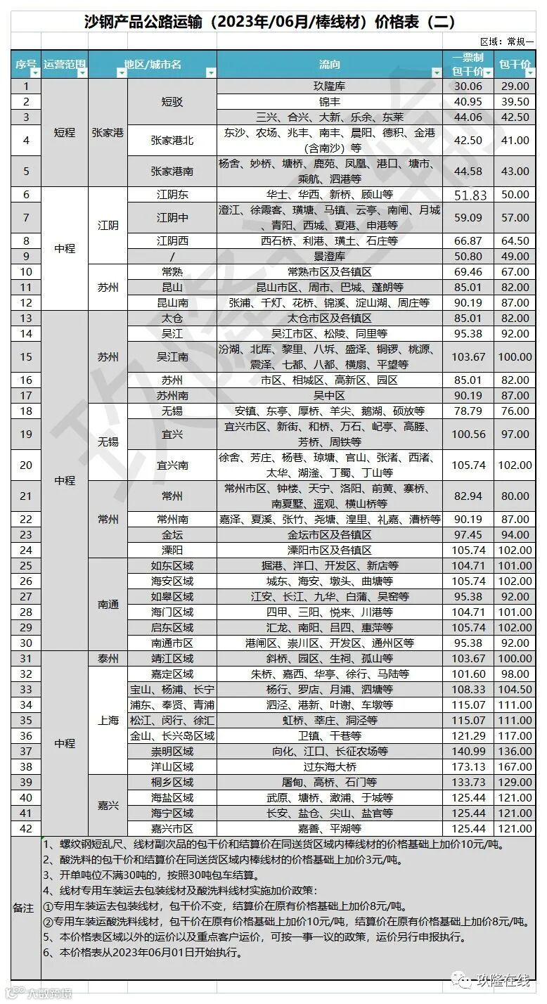 沙钢产品公路运输价格表(2023年6月1日起执行)