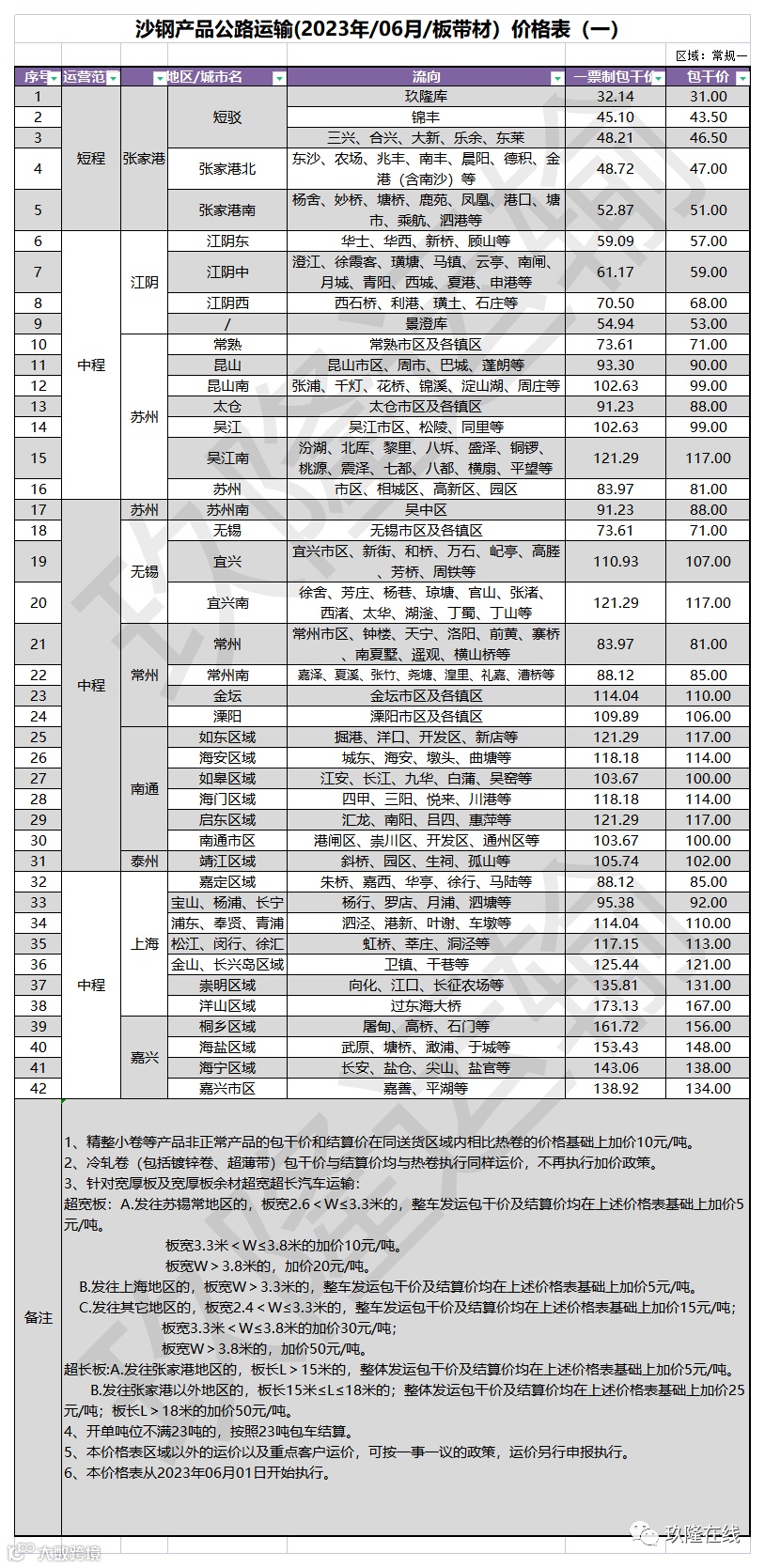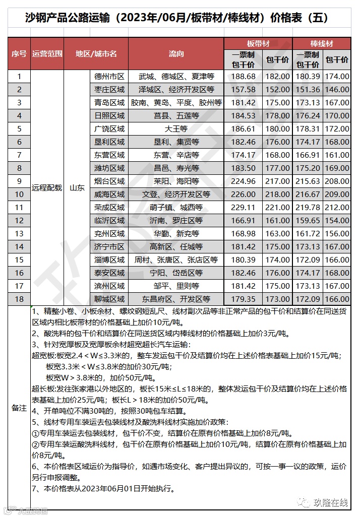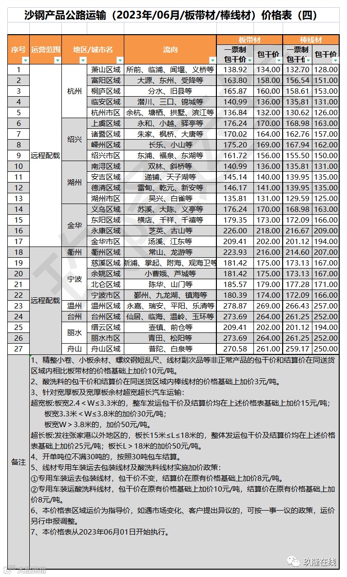 沙钢产品公路运输价格表(2023年6月1日起执行)