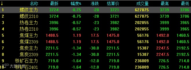 4日晚间螺纹钢跌28,收报3724,跌幅0.75%,周度跌115;热卷主力跌23,收报3996,跌幅0.57%,周度累跌127;焦煤主力涨17.5,收报1488.5,涨幅1.19%,周度累跌15;焦炭主力跌30,收报2211.5,跌幅1.34%;铁矿石跌12,收报719,跌幅1.64%。