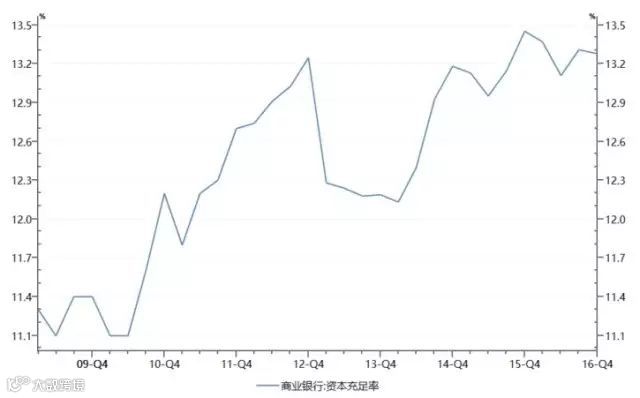 而前一个杠杆,即银行的杠杆,则是典型的金融杠杆。但银行的杠杆水平,我们一般不看它简单的资产负债率,而是另有杠杆率(一级资本净额/调整后的表内外资产余额)、资本充足率等监管指标。其中,资本充足率还考虑了不同资产的风险权重,更加精细,是最为重要的指标。截止2016年末,我国商业银行的资本充足率是13.28%,是非常健康的水平,在近几年也保持稳定,所以表面上看,银行的杠杆水平并不高。