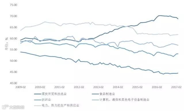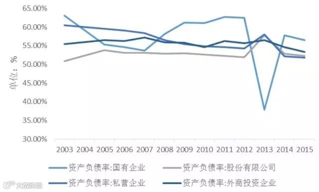 其中,后一个杠杆是企业的负债水平,一般用资产负债率来衡量。比如,不同的企业群体,会有不同的资产负债率: