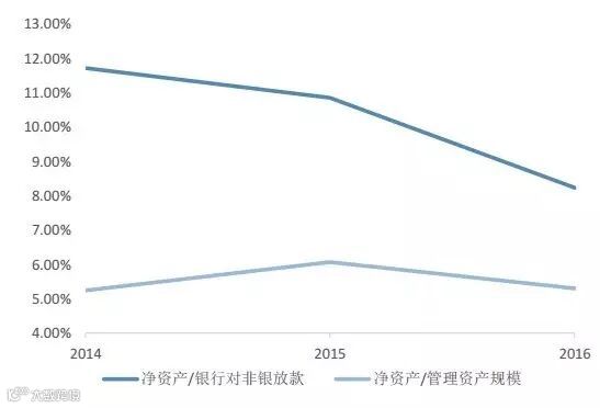 将各行业净资产除以各行业管理的总资产,得到的结果是5.31%。当然,还可以用另一个分母,即把银行对非银放款总额(2016年12月为26.53万亿元)当分母,算出来是8.24%。