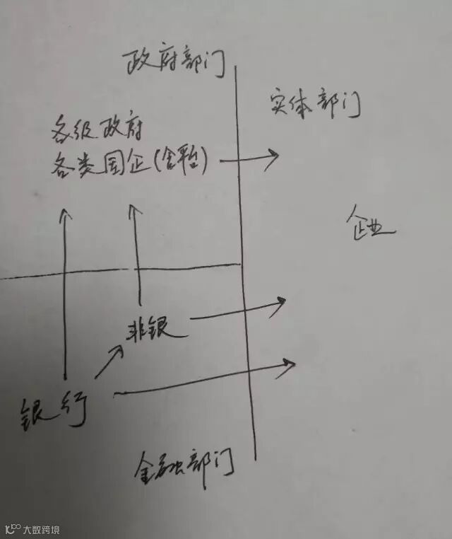 (上图是打破会计科目桎梏,而是基于交易实质。箭头代表资产运用方向,存款等负债业务暂不体现。非银包括“大资管”,也就是包括银行理财。国企、平台因为基于政府信用而实现融资,因此被纳入政府部门)