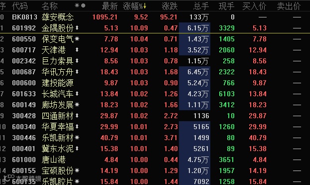 今天是A股清明节后开市首日,雄安概念股开盘集体上演涨停潮,冀东水泥、金隅股份、华夏幸福、京汉股份、巨力索具、唐山港、北京城建等逾40只个股纷纷一字封涨停,河北板块个股几乎全线涨停。