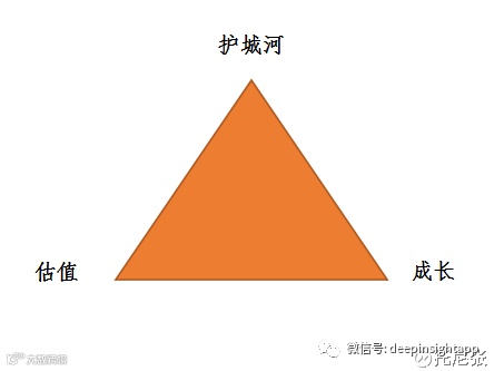 细心的朋友不难发现,上图的等边三角形以“护城河”为顶,似乎高高在上,比估值和成长更重要。谁说不是呢?估值也好,成长也罢,都能从过去的数据中挖掘出来,但唯有护城河这一项,却需要深刻的基本面分析和敏锐的商业洞察能力。