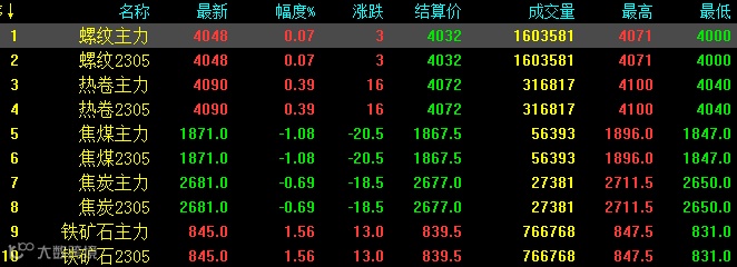 29日螺纹钢主力涨3,收报4048,涨幅0.07%;热卷主力涨16,收报4090,涨幅0.39%;焦煤主力跌20.5,收报1871,跌幅1.08%;焦炭主力跌18.5,收报2681,跌幅0.69%;铁矿石涨13,收报845,涨幅1.56%。
