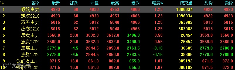 昨日螺纹主力期货涨60,收报4923,涨幅1.23%;热卷主力涨62,收报5015,涨幅1.25%;焦炭主力涨20,收报3560,涨幅0.56%;焦煤主力跌4.5,收报2779,跌幅0.16%;铁矿石涨16,收报871.5,涨幅1.87%。
