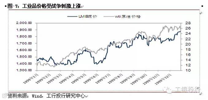 工业品价格也受到战争刺激,3月22日战争爆发后,铜价格开始逐步走高,原油价格更早一些的时候已经开始上涨,到5月6日七国会议宣布和平解决后,这波上涨宣告结束,期间原油价格上涨20%,铜价上涨14%。