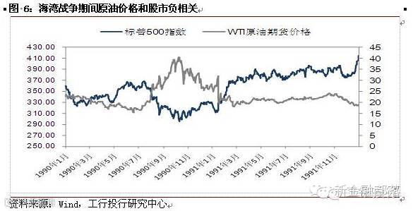 美国股市在这次海湾战争中的表现基本上是跟随原油价格的波动而波动,从走势上和原油价格形成了比较完美的反相关关系。战争前期原油价格大幅飙升之际,美国经济陷入衰退,美国股市也受高油价影响大幅下跌。战争后期原油价格开始下跌,标准普尔指数也筑底回升。到1月16日全面战争前夕,原油价格再次走高,股市也再次探底。之后原油价格跌回起涨点,股市也终于走出了谷底。