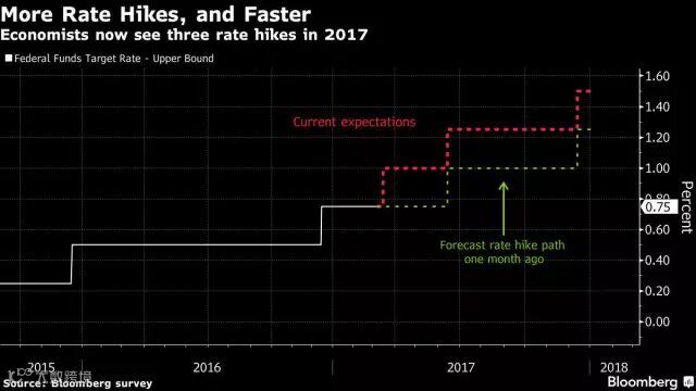 2017年总共将加息3次(含本次在内),2017年年底联邦基金利率预期在1.375%。