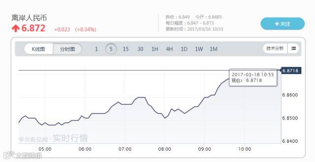 美元对人民币:与全球主要货币汇率一样,人民币也有一定幅度的升值,美元对离岸人民币汇率从1点55分的的6.8850瞬间跌至2点的6.8740。截至北京时间3月16日10点55分,美元对离岸人民币汇率位6.8718。
