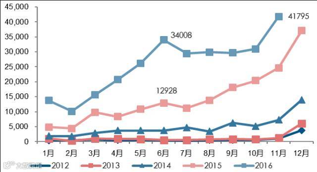2016年新能源乘用车销量情况(辆)