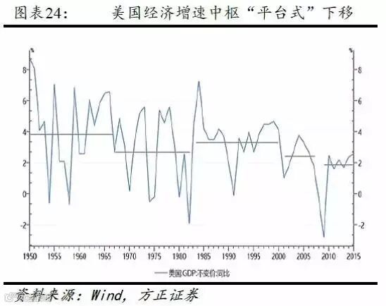 从中长期来看,美国的经济增速中枢已经出现“平台式”下移(图表24)。增速中枢下移的核心根源在于技术进步的变化。