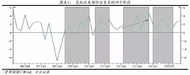 危机爆发八年来,美国经济经历了四个阶段:1.“第一轮脉冲式复苏”(2009年初-2010年底);2.“第二轮脉冲式复苏”(2011Q2-2012Q1);3.“复苏观察期”(2012Q4-2014Q3);4.“救助政策退出期”(2014年10月-2016年底)。