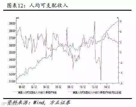 不变价人均可支配收入在金融危机爆发之初曾一度绝对下降,直到2011年之后才恢复到危机前的水平(图表12)。2016年底,美国人均可支配收入为3.9万美元,绝对水平比危机之前高出3000美元。人均可支配收入增长也已恢复到危机之前的速度。