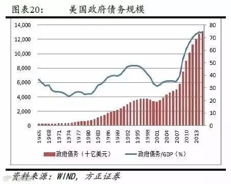 一是债务快速积累,财政负担加重;美国政府在危机期间连年高赤字运营——2009年到2012年的联邦政府赤字率分别高达9.80%、8.75%、8.45%、6.78%。截止2015年底政府债务规模已经突破13万亿美元,相当于当年GDP的73.65%。债务率相比于八年前翻了一番还多。
