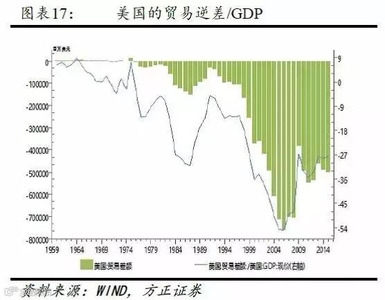 相对正面的消息是:美国的贸易逆差相比危机之前有所削减,经常项目出现改善。到2015年,美国贸易赤字/GDP比值仅为2.7%。而这一比例在危机之前曾高至5.5%(图表17)。2016年截止11月,美国的货物出口累计金额为13279亿美元,累计进口金额为20050亿美元,货物贸易逆差为6771亿美元。
