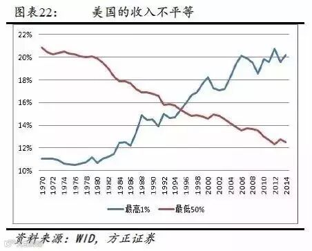 二是不平等加剧,侵蚀内生增长动力:与危机之前相比,收入分配和财富占有不平等的格局都显著恶化了。中位数以下的人群在总收入中所占的份额由13.7%进一步下滑到12.5%;而顶端1%人群的财富占比则由34%增长到了37%。不平等的加剧首先会削弱总需求,从而侵蚀经济可持续增长的内生动力;同时还在无形中造成社会分化。美国社会的共识在减少,不满情绪在增加。