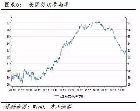 2)劳动参与率持续走低。为了更完整地反映美国就业市场的情况,还需要关注劳动参与率。劳动力参与率=(在业人数+失业人数)/(劳动年龄人数)。
