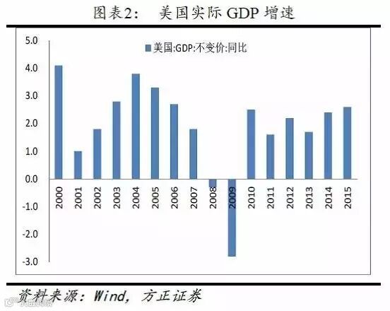 危机并非突然,之前早有征兆。金融危机之前,美国实际GDP增速最高点出现在2004年(3.8%)。此后便逐步回落,到2007年降低至1.8%,比三年前的最高增速下降了2个百分点。从这个角度而言,2008年的金融危机并不是瞬间爆发的,而是早在前几年就已经出现征兆,只不过最终以次贷危机的形式体现出来而已(图表2)。