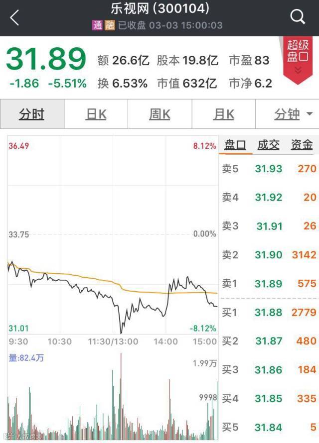 多重利空之下,乐视网周五再度大跌5.51%,收报31.89元/股,目前股价已接近2015年8月的底部区域。