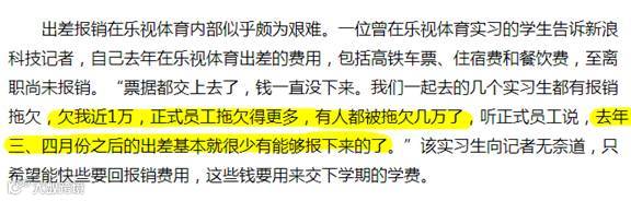 新浪科技周四报道,乐视体育拖欠实习生及正式员工出差报销费用,正式员工拖欠得更多,有人被拖欠好几万。