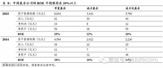 我们同时分析了中国基金行业,相关模式特征与美国同行一致。由于规模扩张不需要消耗资本,中国公募基金能保持“轻资产”运营模式,ROE水平更高,2014/15年,中国主要基金公司ROE在20%以上,而同期中国券商的ROE水平约10%(2014年)/15%(2015年)。有趣的是,中国公募基金存续规模表现出“牛市规模激增,熊市规模阴跌”的特征。即使在熊市,基金资产管理规模也可以保持较高的水平,这也许可以用行为金融解释,如基金投资者(大妈们)在产品七毛以下时常因心理账户、损失厌恶等原因不愿意赎回。这种策略下,中国公募基金的存量规模长期看可以保持稳定增长。