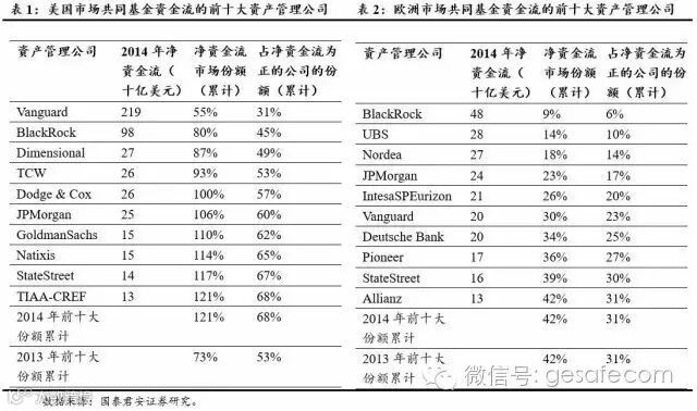 格局集中:美国拥有一大批全球资产规模最大的基金公司,包括Vangaurd,BlackRock等。据统计,从1995年到2012年,美国市场规模最大的5家资产管理公司市场份额从34%提高到了40%,前25的资产管理公司管理的市场份额达到73%。主要原因是大基金公司品牌大,渠道广且产品线丰富。