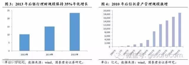 资管规模增长的驱动力在于:宏观经济稳增长带来的财富积累,人口老龄化促进向金融资产转移,互联网等带来的技术创新。同时监管政策环境下,银行等金融机构资产管理业务也在主动转型。根据银行团队的研究,目前银行理财业务与其说是赚取管理费的资产管理业务,不如说是表外的存贷款业务;当前监管导向下,未来银行有望设立资产管理子公司,回归资产管理业务本源,这会扩张资产管理业务规模。此外,全球有近10万亿元以上资产处于负利率环境中,波动率加大,资金的全球配置需求也在显著提升。